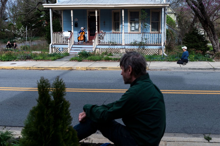 Read morePeople look on from a safe distance as cellist Jodi Beder performs a free concert on her front porch in Mount Rainier, Maryland, near Washington, D.C., on March 30, 2020. Beder started performing daily to help passersby and her neighbors cope with the coronavirus pandemic. #