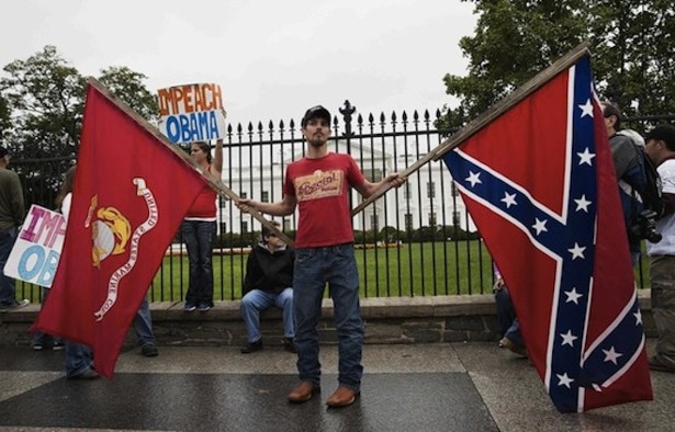 On Sunday, a group of conservative radicals held a protest in Washington. Eventually they walked to the White House. One of these radicals felt it was a good idea to wave the flag of slavery, treason, and terrorism in front of the home of America's first black president. Lone idiots are often drawn to protest action. The behavior of such idiots, while alarming, should not necessarily be taken as an indicator of the aims and thrust of the protest. On the contrary, it is not so much the behavior of the lone idiot that matters—but the tenor of the crowd around him.