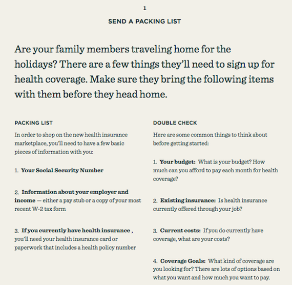 Step 1, in which you tip off adult family members that you'll be talking about their health coverage and instruct them to bring along a dossier of personal information: