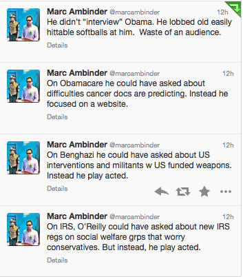 Even that subset of Fox viewers knows there's no chance of any answer that would satisfy them. But hearing O'Reilly allude to their pet theory still gives them a serotonin boost. And that's what O'Reilly was doing in this interview. He was pandering to the part of America that lives within the Fox News bubble, and believes, all evidence to the contrary, that the liberal media never asks the president about Benghazi or the health care web site or the IRS office in Cincinnati.