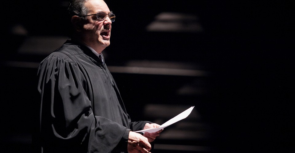 You suggest in your post that the clash of ideas can’t be made dramatically compelling. But to me there’s nothing more compelling than the clash of ideas about the Constitution. And in the theater, other producers are working creatively to bring this clash of ideas to the stage with integrity—such as John Collins, director of Elevator Repair Service, who so brilliantly staged the oral arguments in the Barnes v. Glen Theater nude dancing case from 1991 as the play Arguendo. In that show, the actors read every word of the oral argument transcript, accompanied to wild staging that culminated in a nude dance. The show combined amusement with instruction, to use the Victorian formulation. Collins has faith in the intelligence of citizens, and their ability to follow and engage complicated legal arguments when they’re presented in a dramatically compelling form. It’s too bad that John Strand lacked that confidence, and, for the sake of entertainment, transformed the most intellectually influential justice on the Supreme Court into a soap-opera caricature.