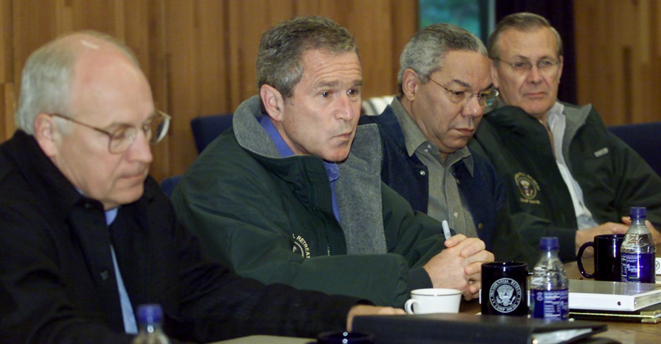 • Four days after the 9/11 attacks, President Bush held a meeting of his advisors at Camp David. Soon after that meeting, rumors emerged of what is by now settled historical fact: that Paul Wolfowitz, with the apparent backing of Donald Rumsfeld, spoke strongly for invading Iraq along with, or instead of, fighting in Afghanistan. (For an academic paper involving the meeting, see this.) The principals voted against moving into Iraq immediately. But from that point on it was a matter of how and when the Iraq front would open up, not whether.