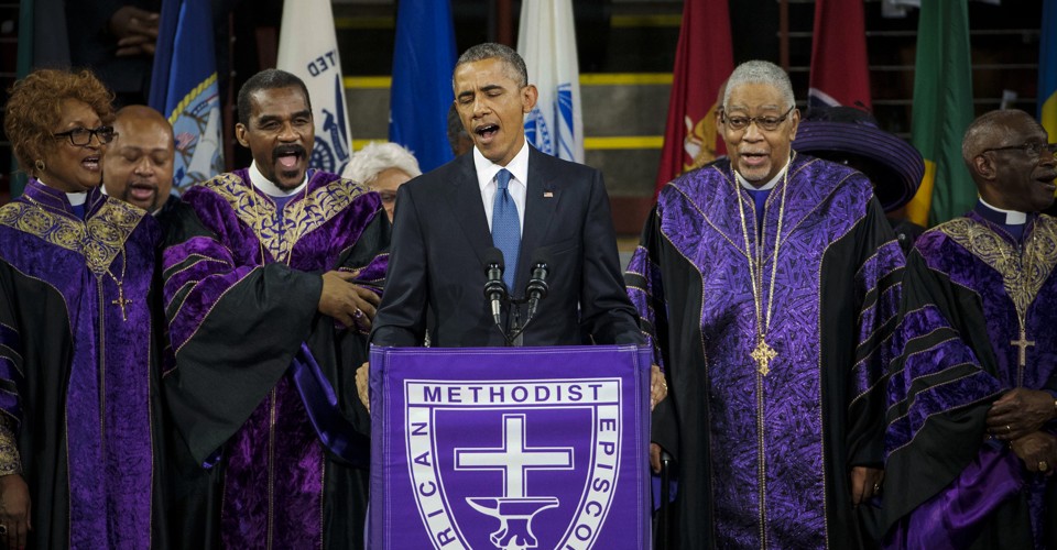 I think Barack Obama’s eulogy yesterday for parishioners of the Emanuel African Methodist Episcopal Church in Charleston was his most fully successful performance as an orator. It was also one that could have come only at this point in his public career—and not, for instance, when he was an intriguing figure first coming to national notice, as he was during his celebrated debut speech at the Democratic National Convention in Boston 11 years ago; or when he was a candidate fighting for political survival, as he was when he gave his “Race in America” speech in Philadelphia early in 2008.