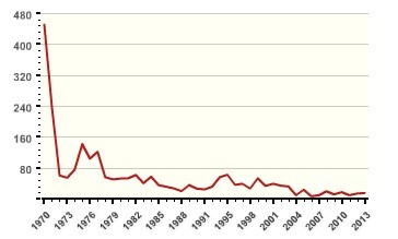 But that’s just the problem: Since 9/11, Americans have lost sight of what the daily reality of terrorism looks like. Most deadly incidents of terrorism or political violence result in fewer than ten fatalities. Terrorism is getting significantly less common stateside, believe it or not—as this chart from the Global Terrorism Database shows: