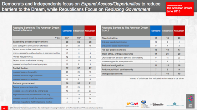 Americans have different ideas about the barriers to achieving the American Dream: Democrats and independents largely believe that lack of opportunity presents the biggest obstacle to achieving the American Dream; Republicans largely believe government is the biggest obstacle.