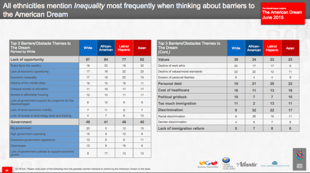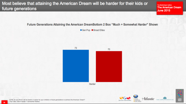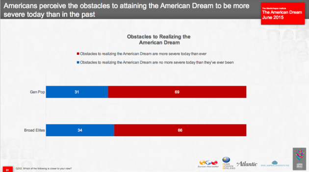 It turns out many Americans agree, according to results from a new poll on the American Dream, conducted by Penn Schoen Berland for The Atlantic and the Aspen Institute and released at the 11th Aspen Ideas Festival on Wednesday. A majority of respondents think the American Dream—which they generally define as financial stability and security—is suffering, and they see more severe obstacles to achieving the dream today than ever before. They’re also split on the precise problems that have caused the dream to falter and on the best ways to solve those problems.