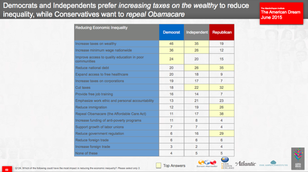 Democrats and independents think that raising taxes on the wealthy is the best way to reduce inequality, while Republicans believe repealing Obamacare would be most effective.