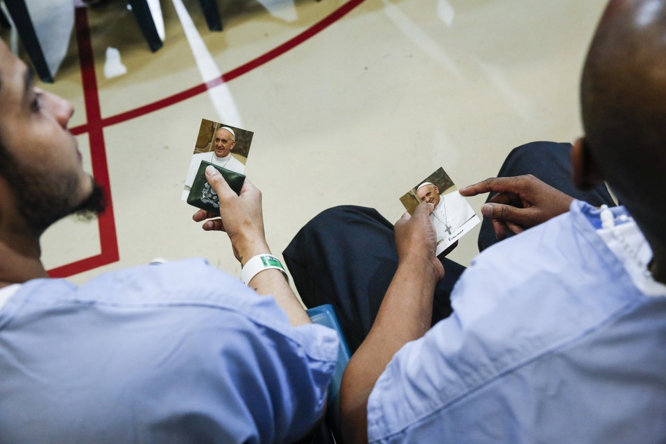 There are all kinds of people who flow through this purgatory, and the staff tried to select a group of roughly 80 papal visitors who would be representative of the population: a handful of women from the nearby Riverside Correctional Facility; an even mix of blacks, whites, Hispanics, and Asians, even though Curran-Fromhold is 70 to 80 percent black, Gainey said; and mostly Catholics, with at least a few Muslims and people who called themselves “Christian.”