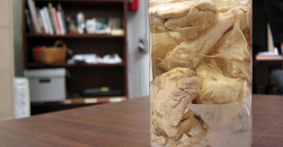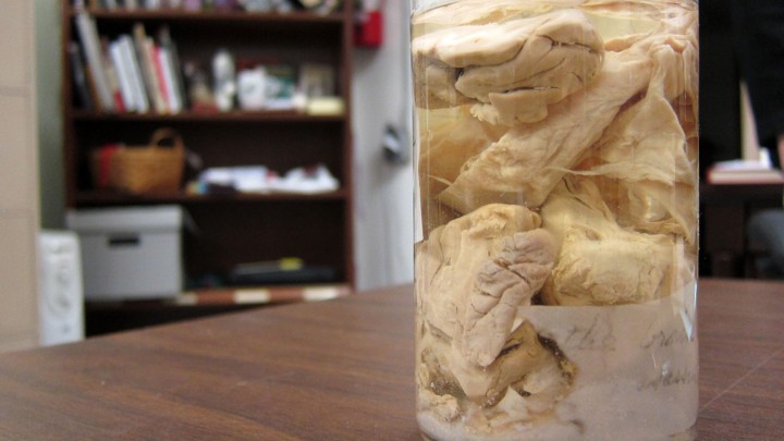In a slender jar, several sections of century-plus-old brain float—like marinated artichokes in a jar—in a solution of 70 percent alcohol and 30 percent water. A label reads: “Portions of brain of Charles Guiteau, assassin of President Garfield.”