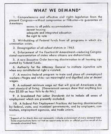 Before the March on Washington in 1963, the coalition of civil-rights organizers and activists who planned the protest published a list of ten demands in a brief program.