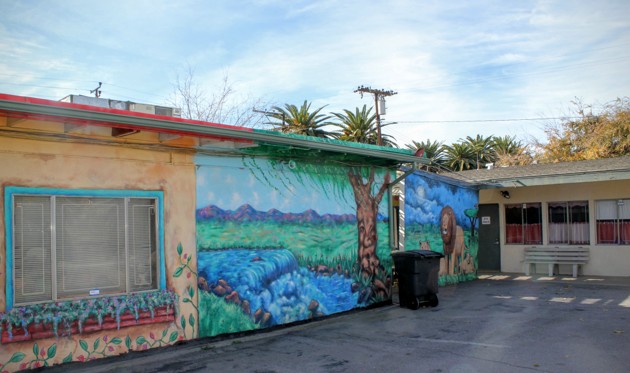 In the real-time uncertainty of the news, I won’t give the name or address of that other center right now, nor show pictures of the people we saw there. I will say that it was a place where patient, generous instructors work with adult-age local people who had a range of developmental problems, so as to bring out the students’ artistic possibilities and skills. Here’s the kind of thing I’m talking about: murals on the outside of the (obviously very modest) classrooms.