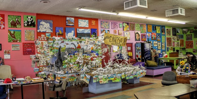 And an inside view, featuring drawing and paintings and the center’s best known student work: a “Dinosaur Museum” of many dozens of model dinosaurs, lovingly fashioned out of tin foil by a large, gentle, middle-aged man who as a student at this center has specialized in them for many years. (This photo is at a distance, but for the moment I don’t want to use any of the closer scenes showing the dinosaur artist or other individuals.)