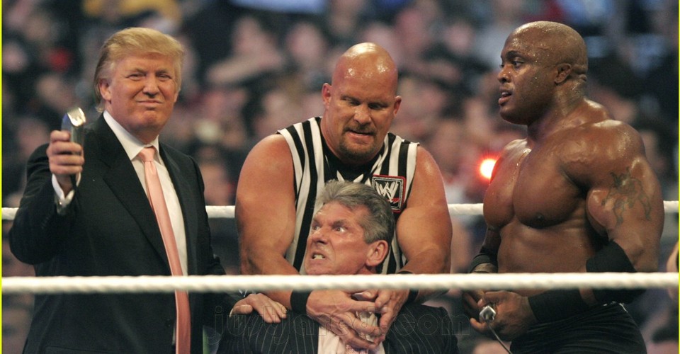 The Republican primary has become a pro-wrestling contest. If you think that’s just a metaphor, check out this video of Trump stepping into the ring to shave Vince McMahon’s head at Wrestlemania XXIII. Trump’s dismissive affect toward his wrestling rival is identical to the way he diminishes his mewling low-energy/choker/liar/whiny-baby opponents on the debate stage.
