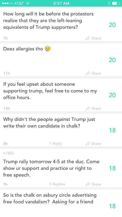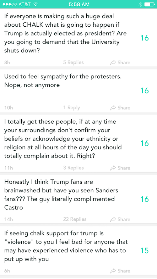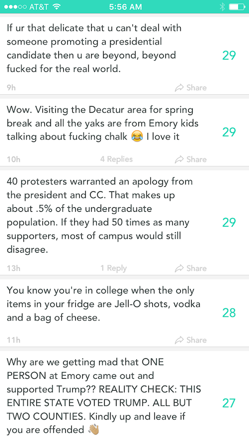 On Yik Yak, a social media app popular among college students in large part because it permits anonymous speech, the Emory student reaction to the chalk controversy wasn’t mixed, as often happens when one views that platform during a campus controversy. It was clearly, overwhelmingly antagonistic to the student activists. Keep in mind that the content that follows, which went on for scroll after scroll, dominating the platform, was all posted within 1.5 miles of Emory’s campus: