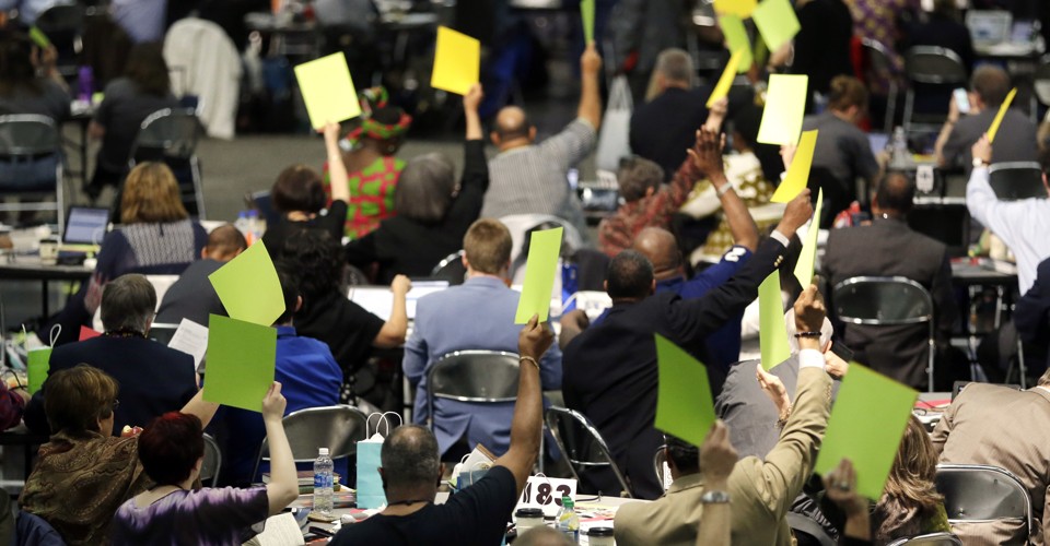 This doesn’t mean the way forward is clear, though. “I don’t even want to think about two to four more years of divisiveness, distrust, confusion, living in tension, demonstrations, acts of disobedience,” said one delegate during discussion on Wednesday after the initial announcement. “We’re here, and we were elected to come here and do something in 2016,” said another. Later, a young man stood up. “Quit being afraid to stand for what you believe in,” he said. “This is what the gospel teaches.”