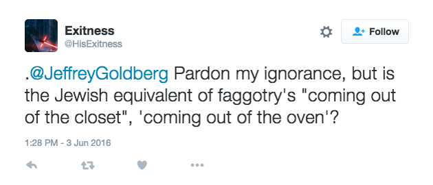 On the other hand, I don’t want to mitigate the damage done by the far-right. I’ve met people who are traumatized by the explosion of on-line anti-Semitism, as well as physical-world anti-Semitism—for instance, the young woman I met last night at the Sixth and I Synagogue in downtown Washington who told me that a man in a Trump hat called her a “kike” on the Metro—and so monitoring this phenomenon seems like a worthwhile endeavor. (The Anti-Defamation League will be doing just that.) In the interest of cataloguing a portion of the invective directed my way, (other journalists, including Julia Ioffe and Jonathan Weisman, have reported on their personal Nazi trolls) you will find below a partial listing of what I’ve seen in just the past couple of weeks. A number of quick observations, though, before we begin: