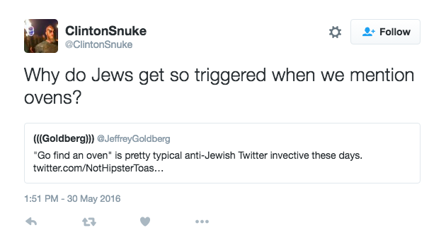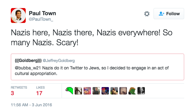 A few days ago, I decided to co-opt one of their Twitter memes, the so-called echo-parentheses they place around Jewish names, for reasons explained here. I’ve always admired what LGBT activists did with the word “queer”—seize it from haters, and make it their own—but I did this on a whim. It caught on (this Haaretz story explains how) , and the phenomenon was met by Nazi howling, and a doubling-down on oven jokes, about which more in a minute.