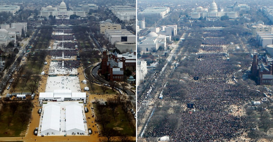 As Spicer later correctly noted, the National Park Service does not offer official crowd estimates. The agency abandoned the practice after receiving criticism for its low estimate of the Million Man March in 1995. But independent estimates, and other publicly available evidence, indicates the crowd was smaller than the one that appeared for President Obama’s first inauguration in 2009. Keith Still, a professor at Manchester Metropolitan University in England, told The New York Times that the crowd on the mall itself was about a third the size it had been in 2009. Photos taken from the Washington Monument facing towards the Capitol show a visibly smaller audience compared to similar images taken in 2009, images from the parade route showed largely vacant stands and stretches of empty sidewalk, and Washington mass-transit officials reported far comparatively lower ridership figures for the city’s Metro system.