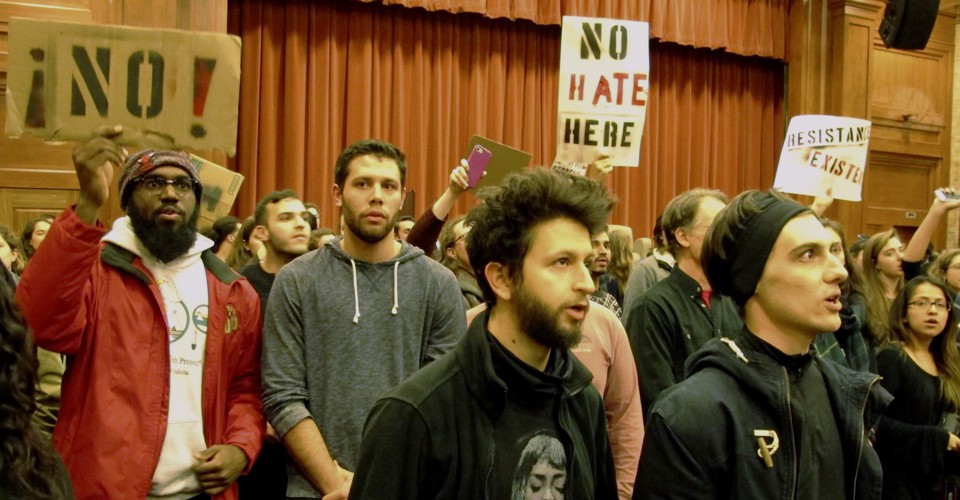 The student went on to observe, correctly, that “a lot of media presented this as an issue between liberals and conservatives, but I think that this is inaccurate and misleading. Although the talk was organized by conservatives,” he wrote––the two student organizers I spoke to actually described themselves as libertarians, and said that the AEI club has leadership that is ideologically mixed––“the vast majority of those who profoundly opposed the disruptive nature of the protests, myself included, identify as liberals. Liberals and conservatives are together in this against a small but arrogant and vocal group that seems to be questioning the very value of free speech and civil discourse.”