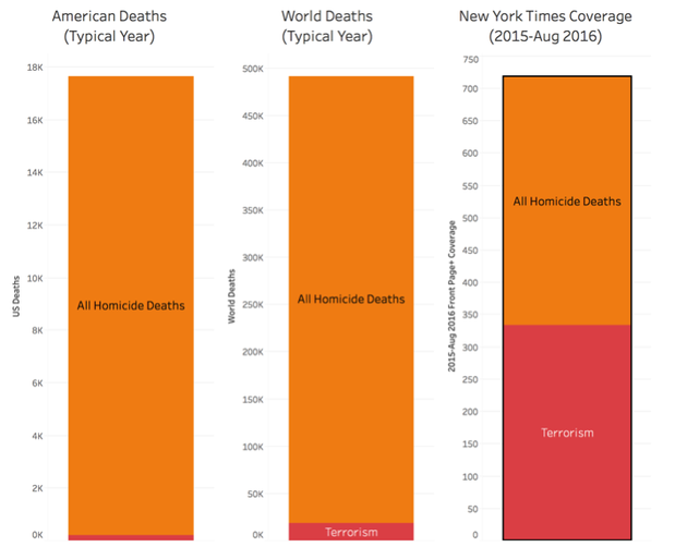 In a 2015 Pricenomics analysis, Nemil Dalal found that “terrorism deaths are the single most heavily covered type of death per capita in the first pages of the New York Times compared to every other way a human can die.” That approach inevitably creates a false impression that terrorism is a major source of death in Europe and the U.S. The appropriate response is not to stop running articles about terrorism––it is to adopt the default inclusion of contextual information like this chart: