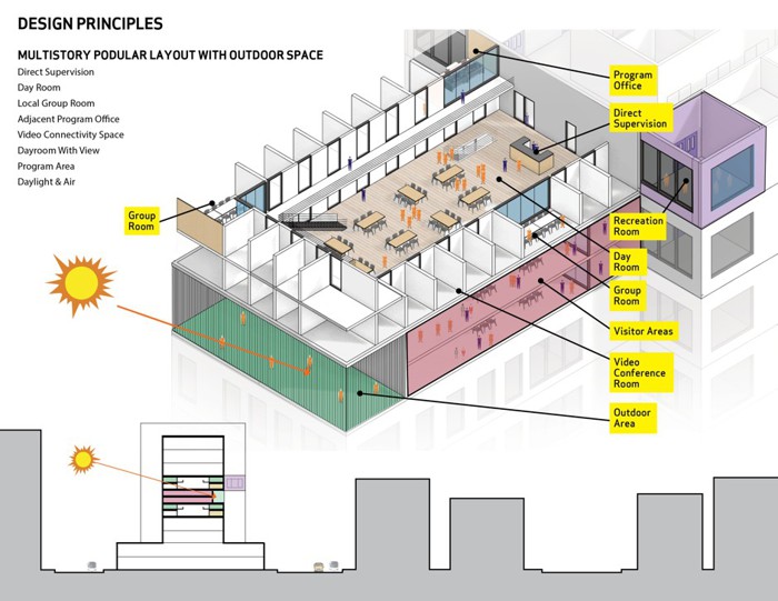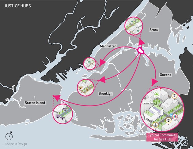 That’s why, for one, “justice hubs” are rooted in each borough, close to courts. The obvious benefit of a dispersed network of jails is that detainees get easier access to legal counsel, hearings, service providers, and their families. “The crux of the project is looking at the jail system as something that could ideally be decentralized … leading to higher levels of efficiency not just for the jail system itself, but for the city,” says David van der Leer, the executive director of Van Alen Institute.