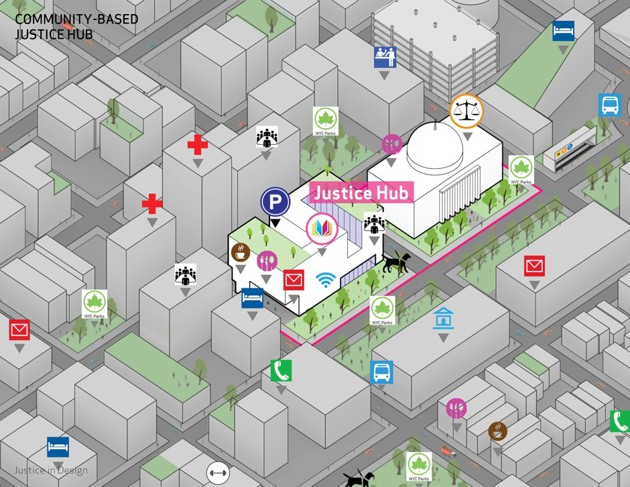 In addition, the report suggests introducing justice hubs as assets for the neighborhoods they’re place in, not problems. Overcoming the NIMBY fears of nearby residents would be a tall order: To that end, the authors recommend including amenities like libraries, public plazas, community gardens, art studios, and areas for providing medical and social services.
