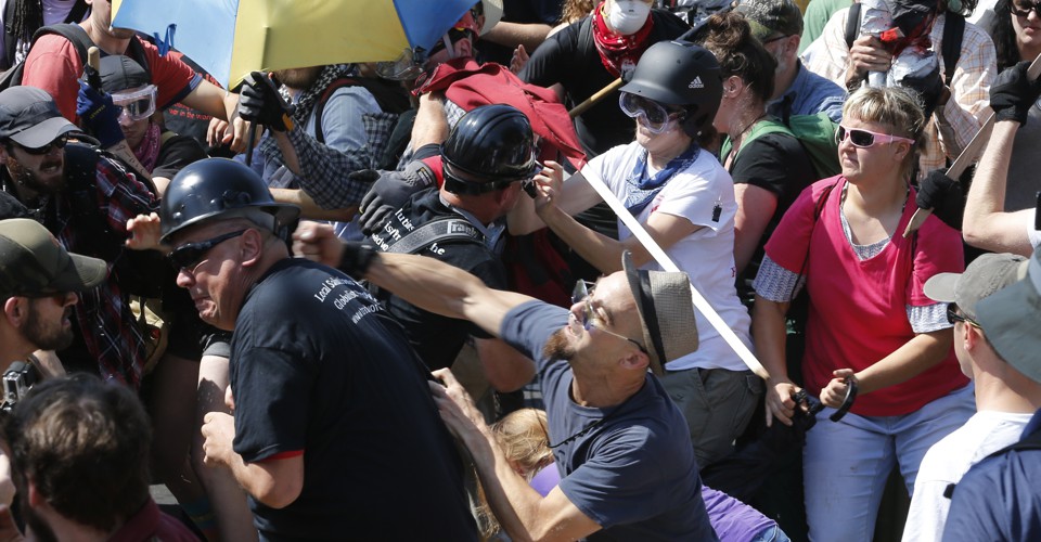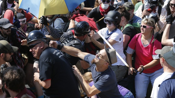 A counter demonstrator uses a lighted spray can against a white nationalist demonstrator at the entrance to Lee Park in Charlottesville, Virginia. (Steve Helber / AP)White nationalist demonstrators clash with counter demonstrators at the entrance to Lee Park in Charlottesville, Virginia.(Steve Helber / AP)Colleen Cook, 26, holds a sign as hundreds of people are facing off in Charlottesville, Virginia, ahead of a white nationalist rally planned in the Virginia city's downtown. (Sarah Rankin/ AP)Members of white nationalists clash against a group of counter-protesters in Charlottesville, Virginia. (Joshua Roberts / Reuters)Members of white nationalist protesters seek protection with shields as they are confronted by a group of counter-protesters in Charlottesville, Virginia. (Joshua Roberts / Reuters)A group of counter-protesters march against members of white nationalist protesters in Charlottesville, Virginia. (Joshua Roberts/ Reuters)Members of white nationalists are met by a group of counter-protesters in Charlottesville, Virginia. (Joshua Roberts / Reuters)
