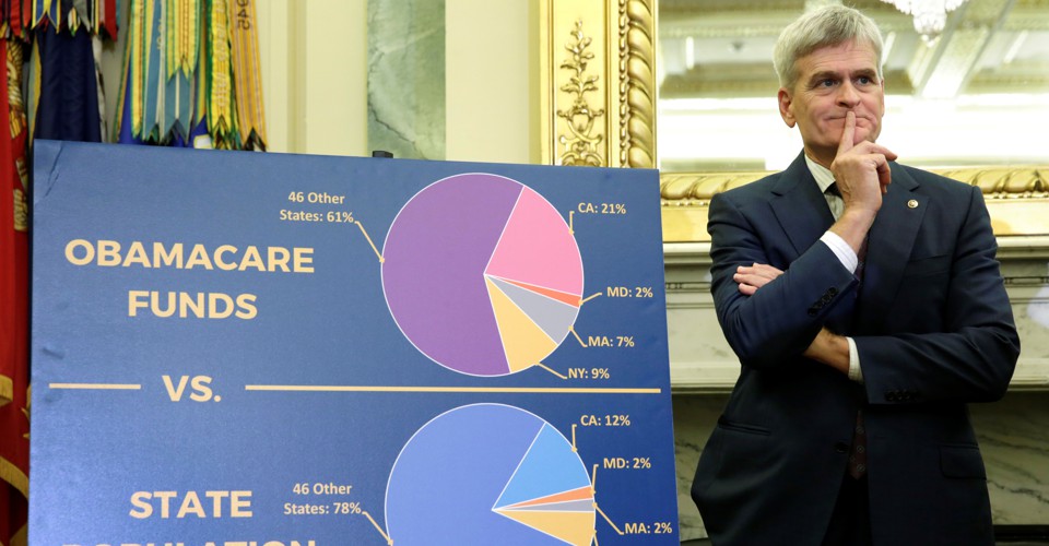 “Obamacare, for whatever reason, favors four blue states against the rest of us.” So South Carolina Senator Lindsey Graham, in a floor speech on Monday, defended the central rationale of his Obamacare replacement, the Graham-Cassidy bill. In that speech and other statements, Graham has cast his bill as a redistribution, taking federal Obamacare money poured into the liberal bastions of California, New York, Massachusetts, and Maryland, and giving some of it to cash-strapped red states that have been left out, and whose sicker populations have languished. In this telling, Graham is Robin Hood, and his co-sponsors Bill Cassidy of Louisiana, Dean Heller of Nevada, and Ron Johnson of Wisconsin are his merry men.