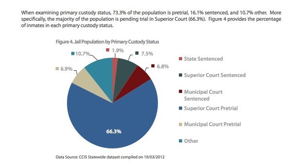 In 2013, 73.3 percent of the jail population was there for pretrial purposes. Also, 71 percent of the jail population was black or Latino that year, and 38 percent of them were there because they couldn’t meet bail conditions.