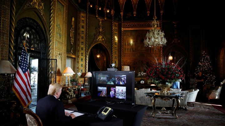But with Fox News switched off, the mood at Mar-a-Lago quickly shifted. Ten minutes after sending the last of his tweets, the president sat down behind his desk at Mar-a-Lago for a videoconference with active-duty military personnel around the world. “I just want to wish everybody a very, very merry Christmas,” he said, according to the pool report. “We say Merry Christmas, again, very, very proudly.”