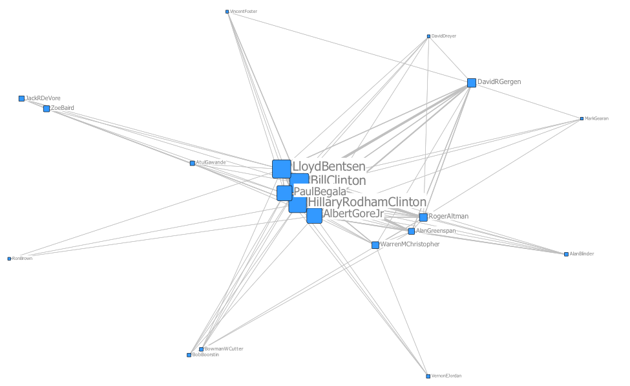 Clinton’s White House graph similarly depicts an inner court formed by Clinton and his wife, along with Bentsen, Begala, and Gore. It was characteristic of Clinton’s first year that Hillary refused to accept the traditional First Lady’s office in the East Wing of the White House, insisting on a presence in the West Wing.
