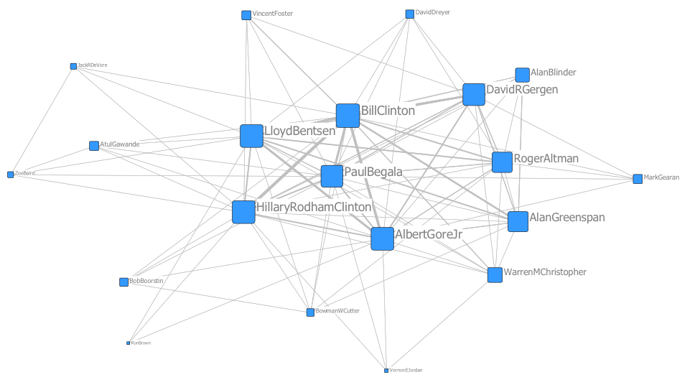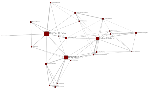 Nonetheless, the centrality scores for the three presidencies, standardized for comparison, reveal a stark difference. Unlike Trump and Clinton, the most between-central actors in their administrations, Nixon came in third behind Harlow and Finch, followed by two officials only about half as central, Ehrlichman and Mitchell. Clinton’s core advisors were all almost as between-central as he was: Hillary, Bentsen, Gore, and Begala.