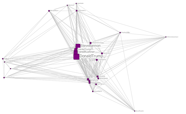 By reshuffling the nodes so that those with stronger, thicker ties are nearer to each other, we see how Jared and Ivanka Kushner and Bannon not only heavily influenced each other, but also had the highest relative influence in the entire administration after the president himself.