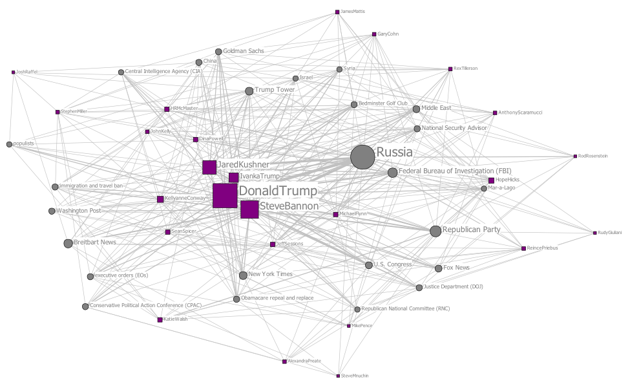 The graph encapsulates Wolff’s narrative, and perhaps also his sources. Trump himself, his son-in-law Jared Kushner, his daughter Ivanka, and his chief strategist Steve Bannon are the most mentioned actors. By comparison, White House Chief of Staff Reince Priebus is barely visible. Russia is by far the dominant theme. The result is far from an objective documentary of White House intrigue. Rather, it is the formal reconstitution of Wolff’s narrative reconstruction of a group’s subjective interpretation of events and their internal dynamics.