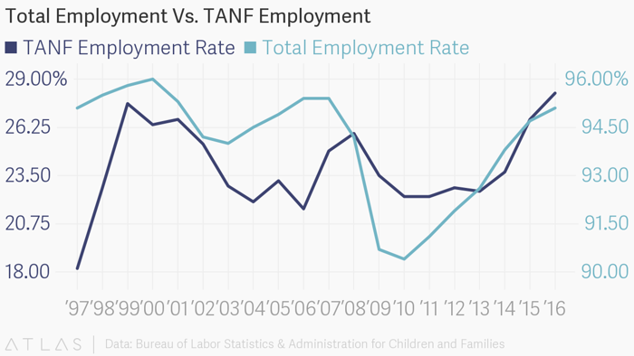 When the bottom fell out of that economy with the Great Recession, TANF—by then already greatly diminished in terms of real value —barely changed, even though the number of Americans in need of assistance had sharply grown. Caseloads during the recession never even reached 2000 levels, despite 21 states dipping into a special TANF contingency fund between 2009 and 2011 to cover increasing costs. Since then, employment rates among TANF beneficiaries have tracked mostly with national employment rates—with little evidence of TANF helping beleaguered poor people back into the workforce at appreciable levels. (One caveat: TANF recipients are much more likely to report barriers to work like illness, disability, or work as a caregiver.)