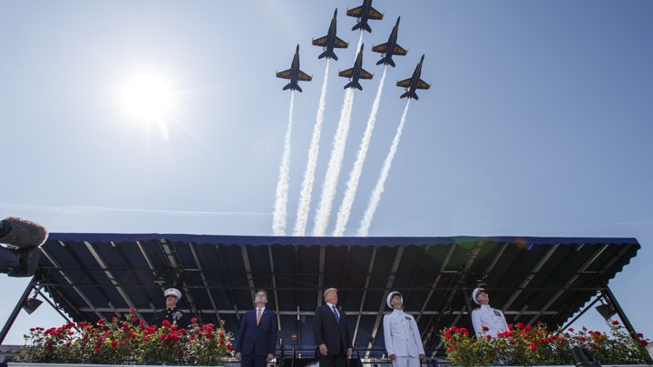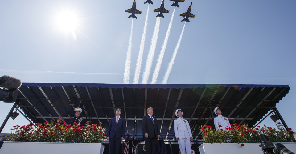 On Friday morning, President Trump gave the commencement speech at the U.S. Naval Academy’s graduation ceremony in Annapolis, Maryland. Among his messages to the 1,042 graduates, the president said that the country has begun “the great rebuilding of the United States military,” and argued that “we are witnessing the great reawakening of the American spirit and of American might.” This was his second time addressing graduates from one of the nation’s military schools: Last year, he gave a speech at the U.S. Coast Guard Academy’s ceremony.