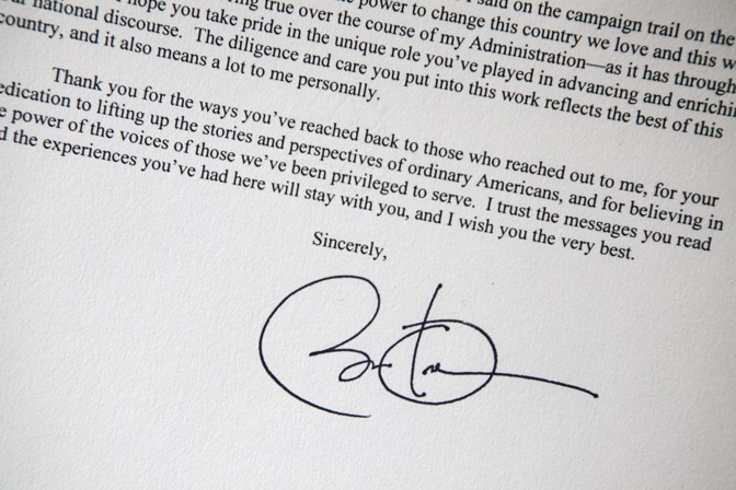 Once Sheryl’s reply was ready, it went back to Blume’s boss, Reeves, for editing. Then it was sent to the printers, back to Reeves for a final proof, and then to Obama to sign, who on occasion also added a personal note at the bottom. He didn’t need to write much, for his words had already been written.