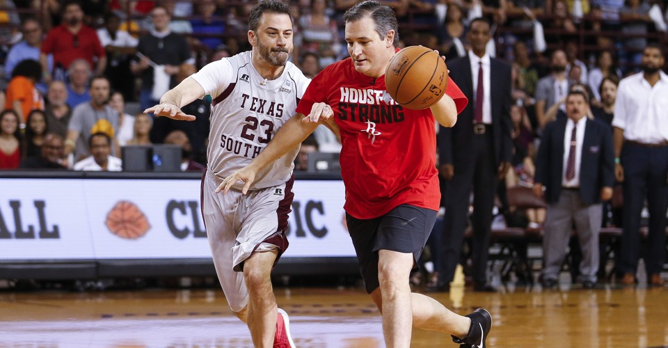 But back to Cruz’s Game Seven tweet. Kimmel started in on him again, joking on TV that the Rockets lost the series because he was at the game. Then he played the “basketball ring” footage for good measure. It stung. Cruz had had enough. On Twitter, he challenged Kimmel to a game of one-on-one, a chance to finally punch back at a liberal gadfly who’d been skewering him for years. “My wife’s got the lights off, telling me to come to bed,” Cruz says. “I tell her I can’t. I’m in the middle of a Twitter war with Jimmy Kimmel!”