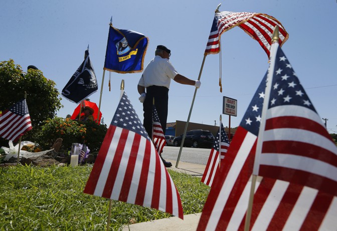 Flags frame David Carrasco, a member of the POW-MIA-KIA Honor Guard, as he stands watch in honor of the late Arizona Republican Senator John McCain at a local mortuary where McCain is being kept in Phoenix.  (Ross D. Franklin / AP)