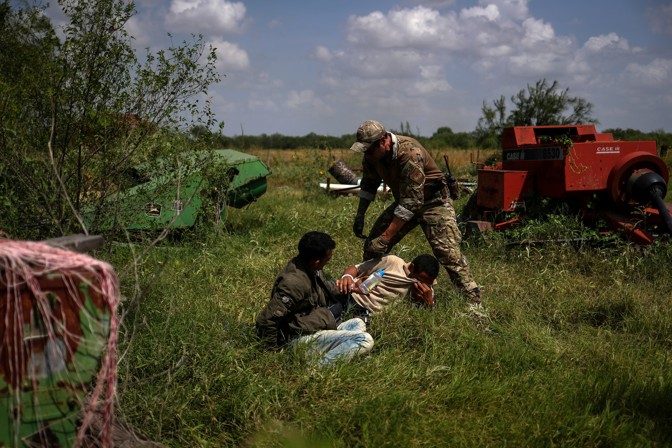 A border patrol agent apprehends men from Brazil after they crossed into the U.S. border from Mexico in Los Ebanos, Texas. (Adrees Latif / Reuters)