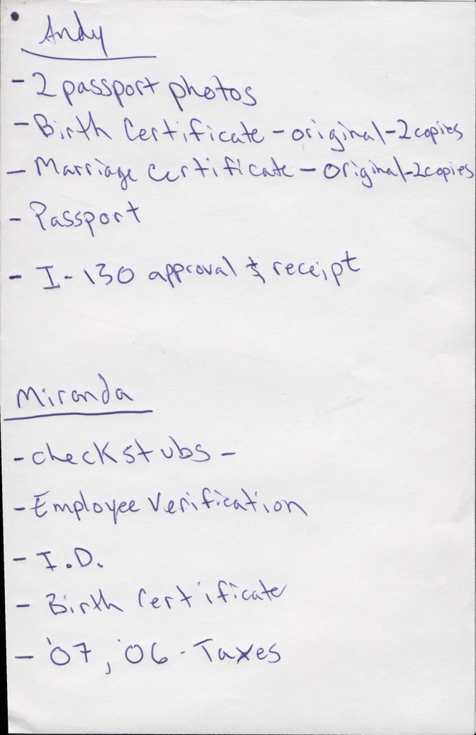 While studying at Fresno City, Andy met a girl. Her name was Miranda. She was a U.S. citizen, born and raised in Fresno. Her family was Mexican too, but the way she and Andy grew up was very different—“two opposite ends of the spectrum,” as she puts it. “He had to go to work in the fields as a kid with his parents … I could run around the neighborhood and play with my cousins.” Miranda and Andy dated for about two years. During that time, Miranda saw how much Andy struggled because of his status. She says that he was depressed because he had been working so hard. They wanted to get him documented—so they decided to get married to help speed up the process. A few weeks after their wedding they started to gather paperwork to petition for his immigrant visa. A few months later, they received instructions from various government agencies on what Andy had to do next.