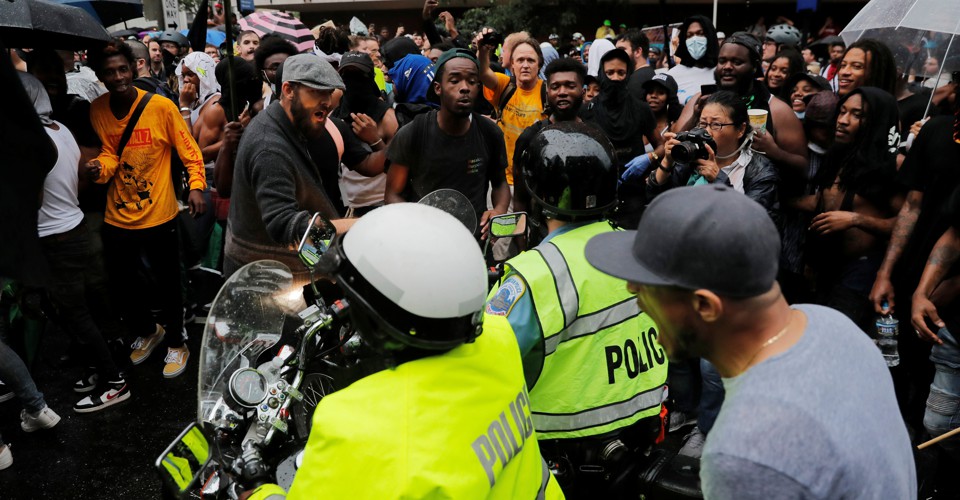 It began to rain in earnest at 5 p.m., and the Unite the Right protesters were ushered away quietly by their police escort. They paused to wait for one of their members, who had gotten caught, bewildered, in the throng of reporters. Across the square, behind the fence and the line of police horses, the counterprotesters didn’t even notice they had left.