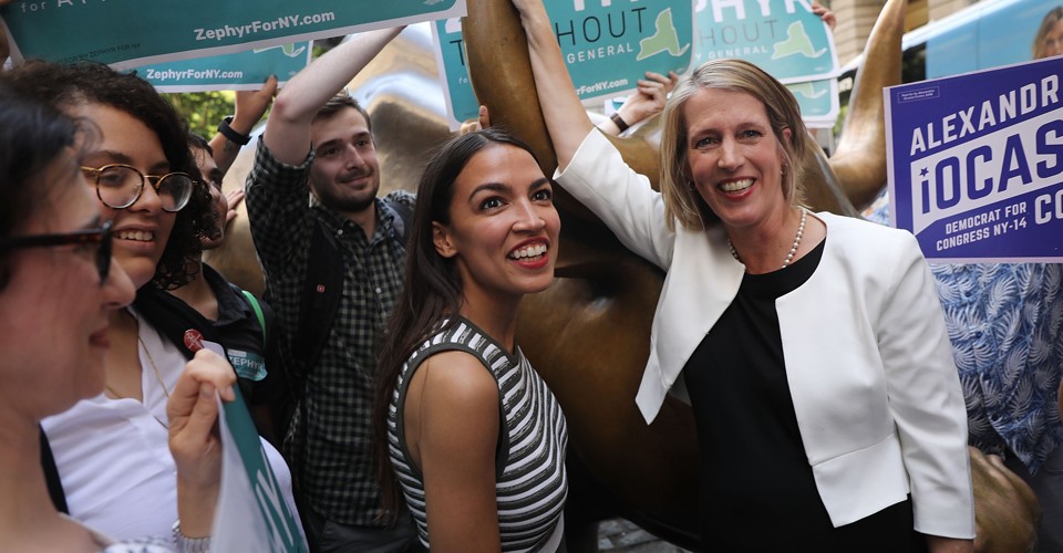 The congressional nominee Alexandria Ocasio-Cortez stands with Zephyr Teachout after endorsing her for New York attorney general.Spencer Platt / Getty