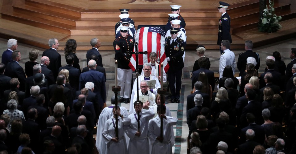 If her words were stern and stinging, the broader theme of the day was redemption. (The civilian mourners included the disgraced CBS anchor Charlie Rose.) The two principal eulogists were the very men who deprived McCain of the presidency: George W. Bush and Barack Obama, and both confessed some surprise at having been chosen for the honor, and spoke with rueful humor of how he had helped make them better presidents. The pews were filled with people (Nancy Pelosi? Paul Ryan?) who don’t agree on much of anything—except for their admiration for McCain, a singular figure whose death has occasioned a moment, however fleeting, of unity in Washington.