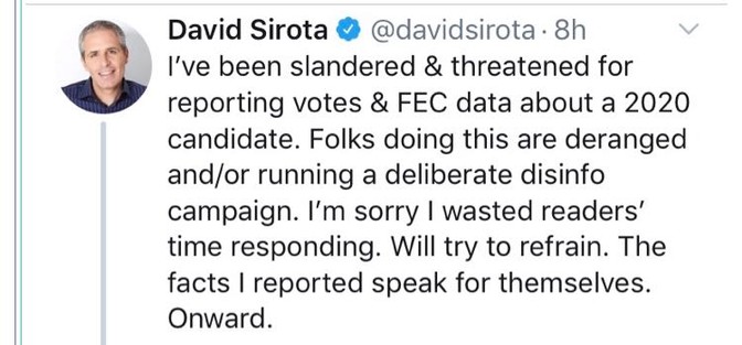 Screenshots taken before the mass Twitter deletion preserve the role that Sirota was playing to his 125,000 followers, trying to turn the early online conversation about the 2020 primary race against other candidates, all while unofficially advising Sanders.