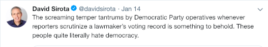 When people have questioned his tactics, Sirota has called them “mentally incapacitated.” Responding in mid-January to those who criticized him online for preemptively railing against the record of O’Rourke, who had not yet entered the race but had been a huge source of concern for Sanders allies since talk of O’Rourke’s potential presidential run picked up last year, Sirota tweeted, “The screaming temper tantrums by Democratic Party operatives whenever reporters scrutinize a lawmaker’s voting record is something to behold. These people quite literally hate democracy.”
