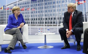 President Trump accused Germany of being a “captive to Russia” because of an energy agreement with the country and urged allies to increase their military spending.