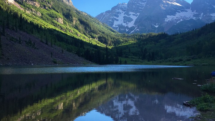 Fourteen miles outside Aspen, as the rental car flies, there are two hump-backed mountains measuring more than 14,000 feet each. They can be seen from a small neighboring valley, from the shores of a shallow lake, whose smooth waters carry an inverted image of the snow-striped peaks. Called the Maroon Bells, for the way they light up red at dawn, the pair are said to be the most-photographed in Colorado, a state with no shortage of sublime scenery.