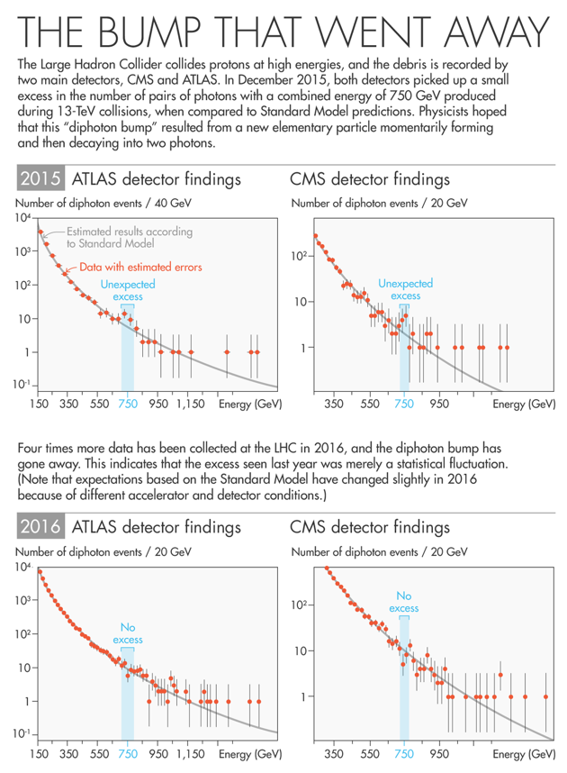 So far, none have materialized. Especially heartbreaking for many is the loss of the diphoton bump, an excess of pairs of photons that cropped up in last year’s teaser batch of 13-TeV data, and whose origin has been the speculation of some 500 papers by theorists. Rumors about the bump’s disappearance in this year’s data began leaking in June, triggering a community-wide “diphoton hangover.”