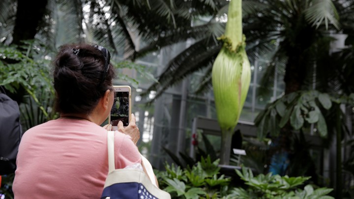 Amorphophallus titanum—amorpho, meaning misshapen; titanum, meaning giant; phallus, meaning phallus. Its common name is titan arum, but even the horticulturalists wandering around its enormous green protrusion on Wednesday called it the corpse flower, a more-or-less direct translation of the Indonesian name bunga bangkai. (Carrion flower would also suffice.) “Also known as the stinky plant,” says the official U.S. Botanical Gardens website.